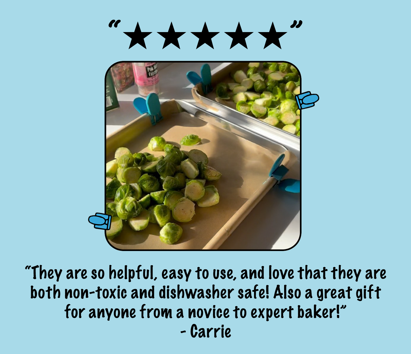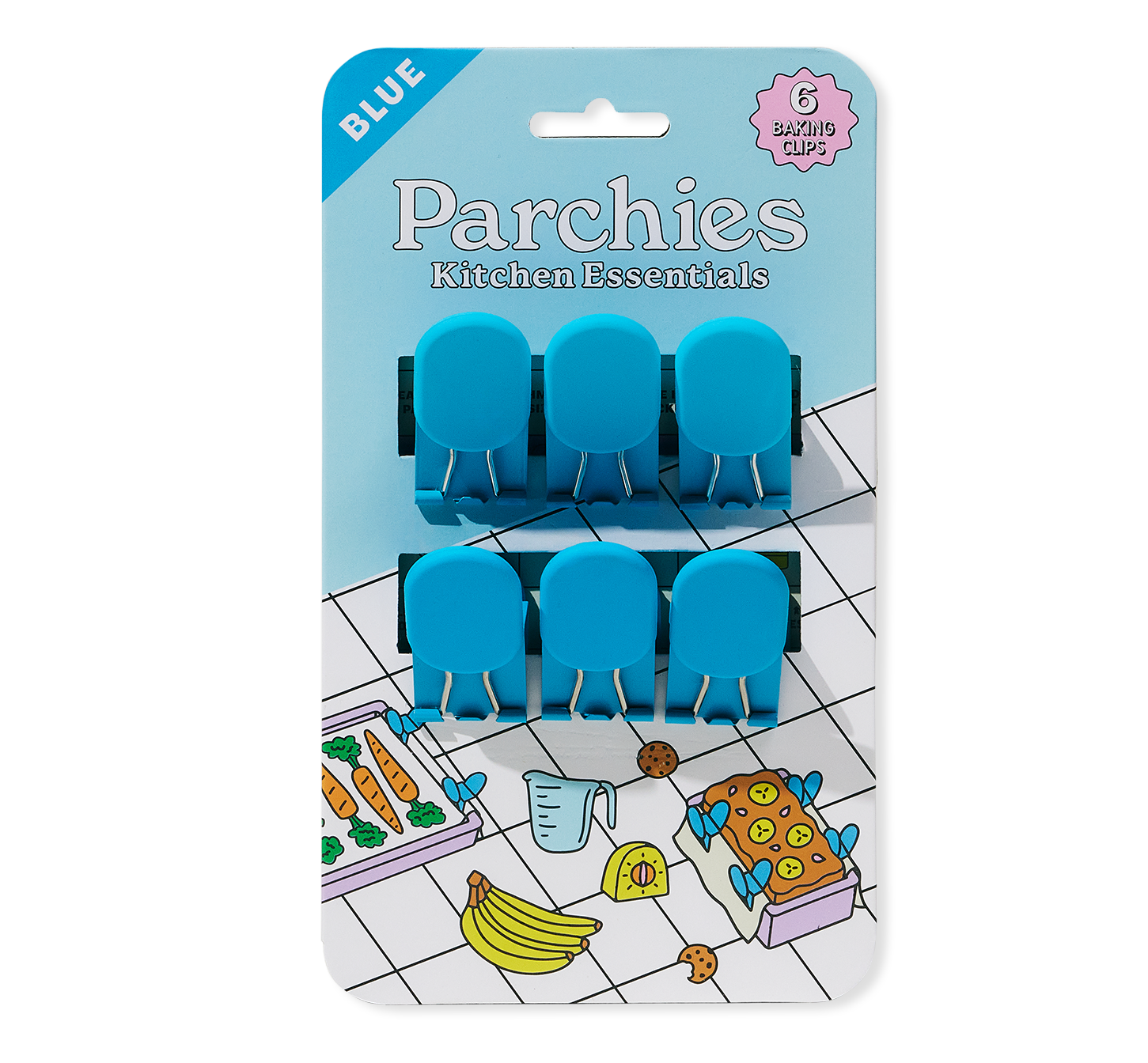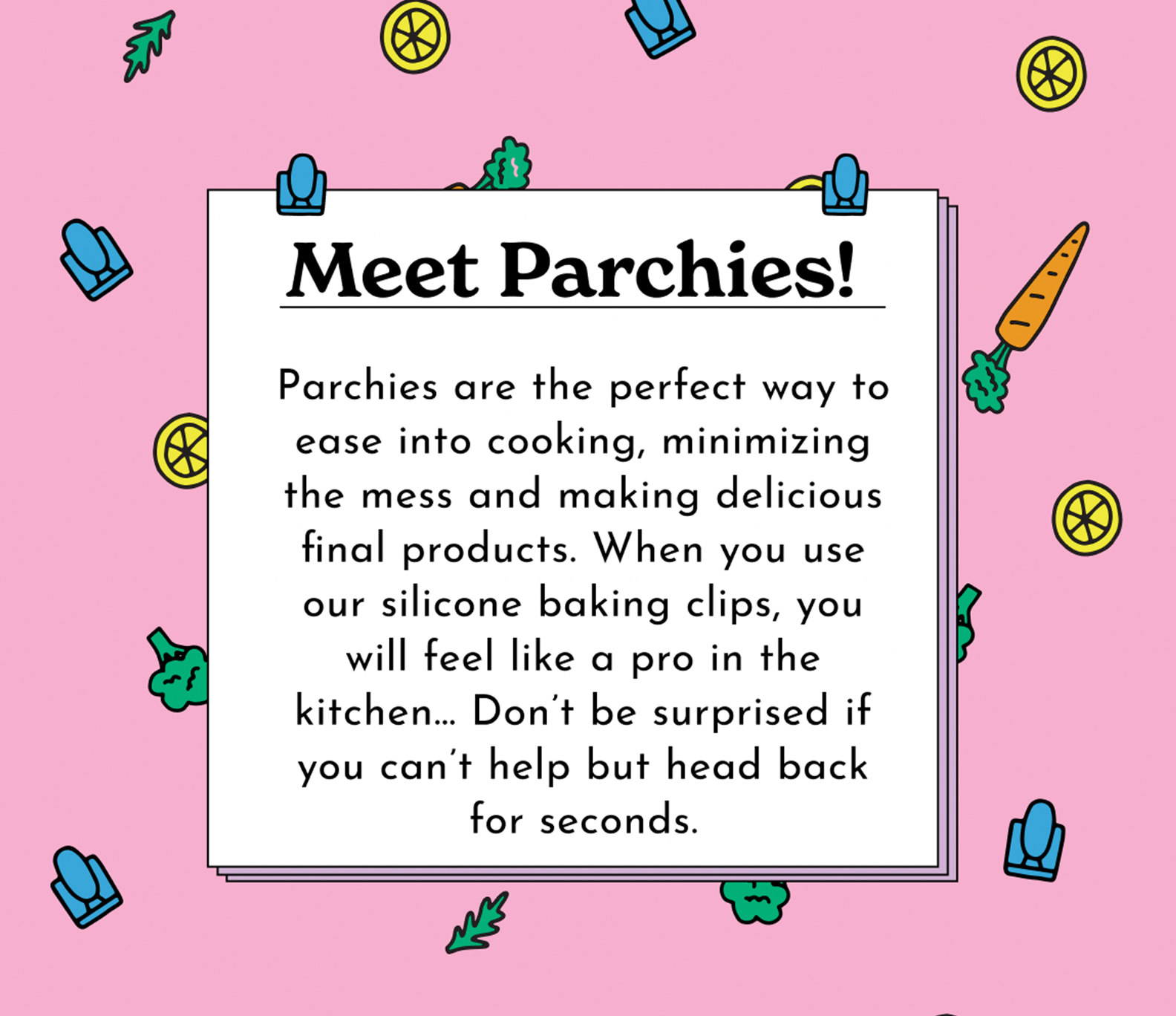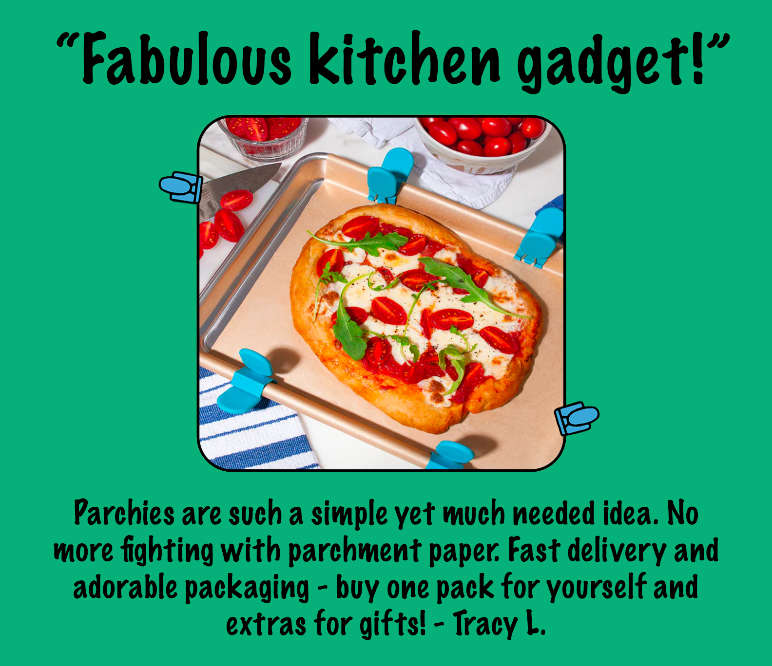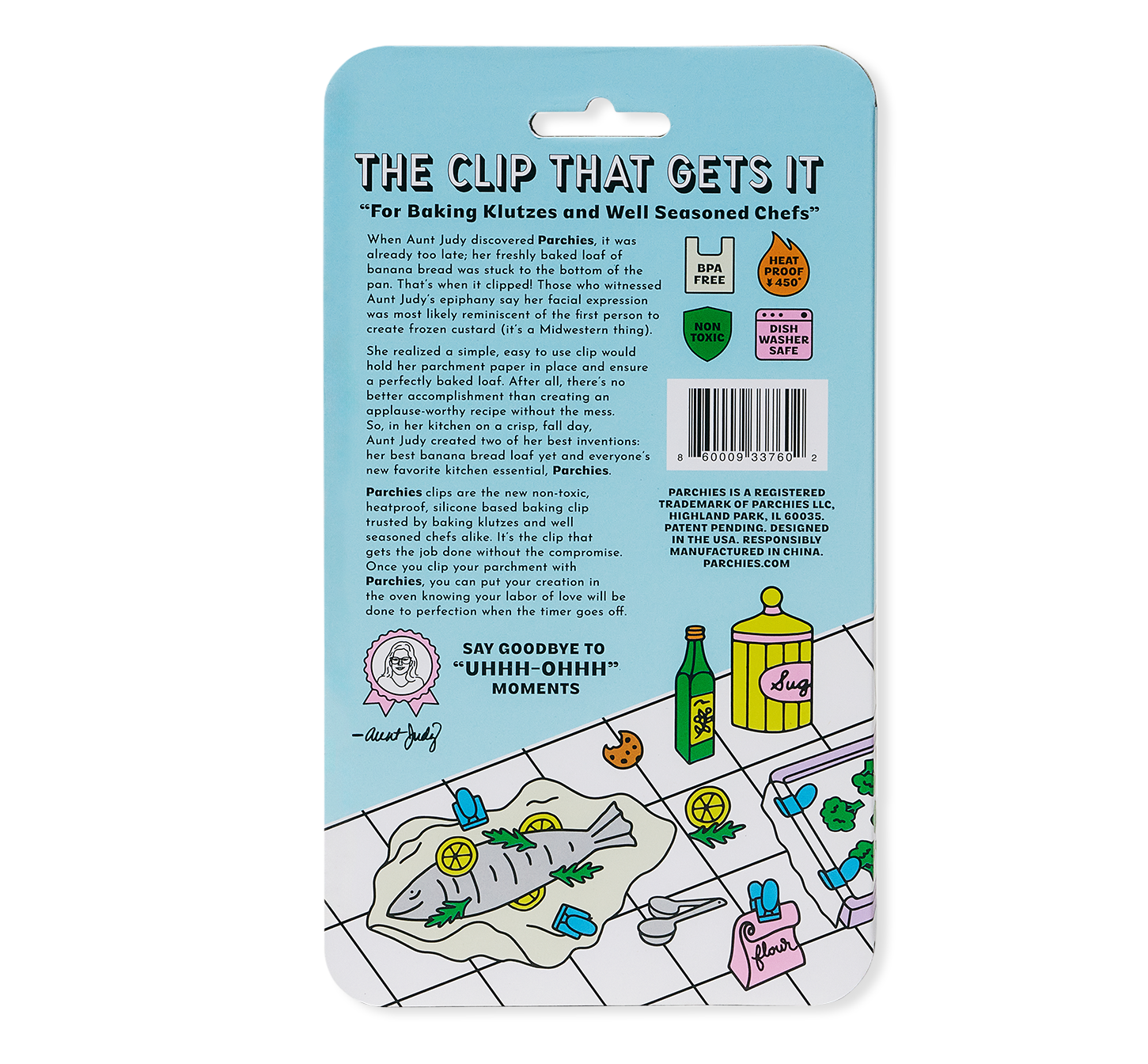 Parchies are an oven safe, silicone coated baking clip that are meant to hold your parchment paper in place for all baking and roasting activities. They are BPA free, non-toxic, dishwasher safe, and oven safe up to 450*.
